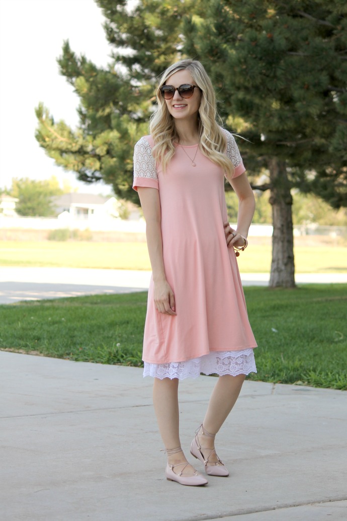 this so cute dress is the right amount of comfort and the right amount of flirty π I love the swingy shape and the lace sleeves just finish it off so perfectly! I’m wearing a slip extender underneath π (bring on all the lace!) but it would be just as cute without it too. there’s something about a pinky peach and white that I think is just so right. you can’t go wrong with such a bright and crisp combo π