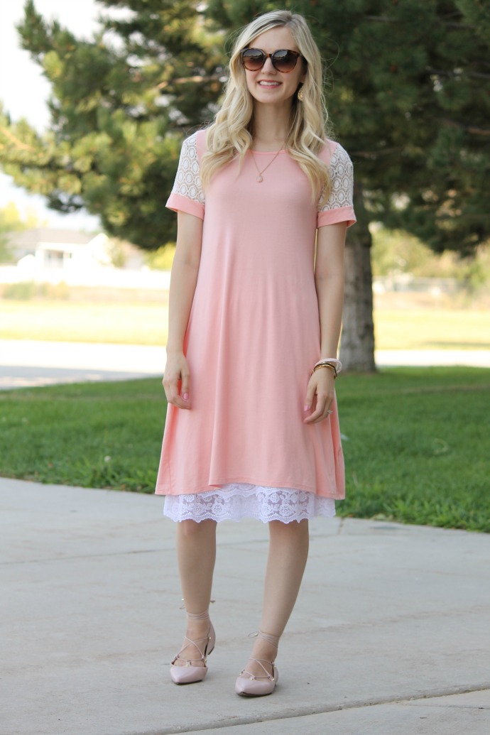 this so cute dress is the right amount of comfort and the right amount of flirty π I love the swingy shape and the lace sleeves just finish it off so perfectly! I’m wearing a slip extender underneath π (bring on all the lace!) but it would be just as cute without it too. there’s something about a pinky peach and white that I think is just so right. you can’t go wrong with such a bright and crisp combo π