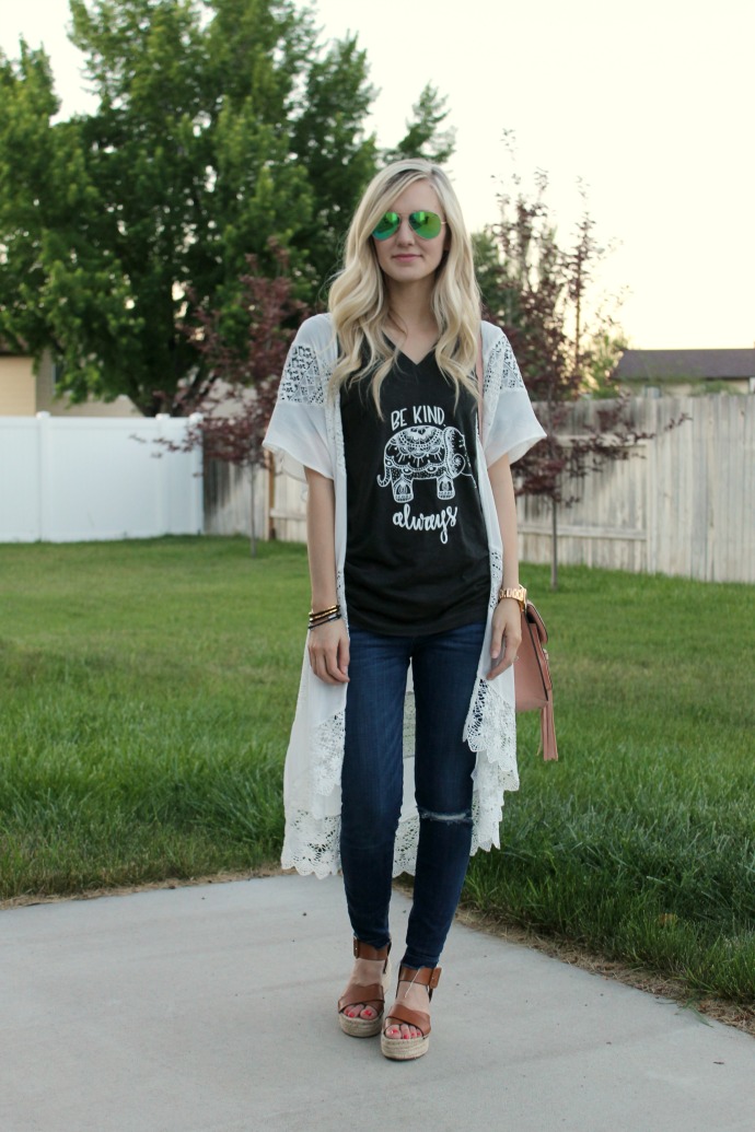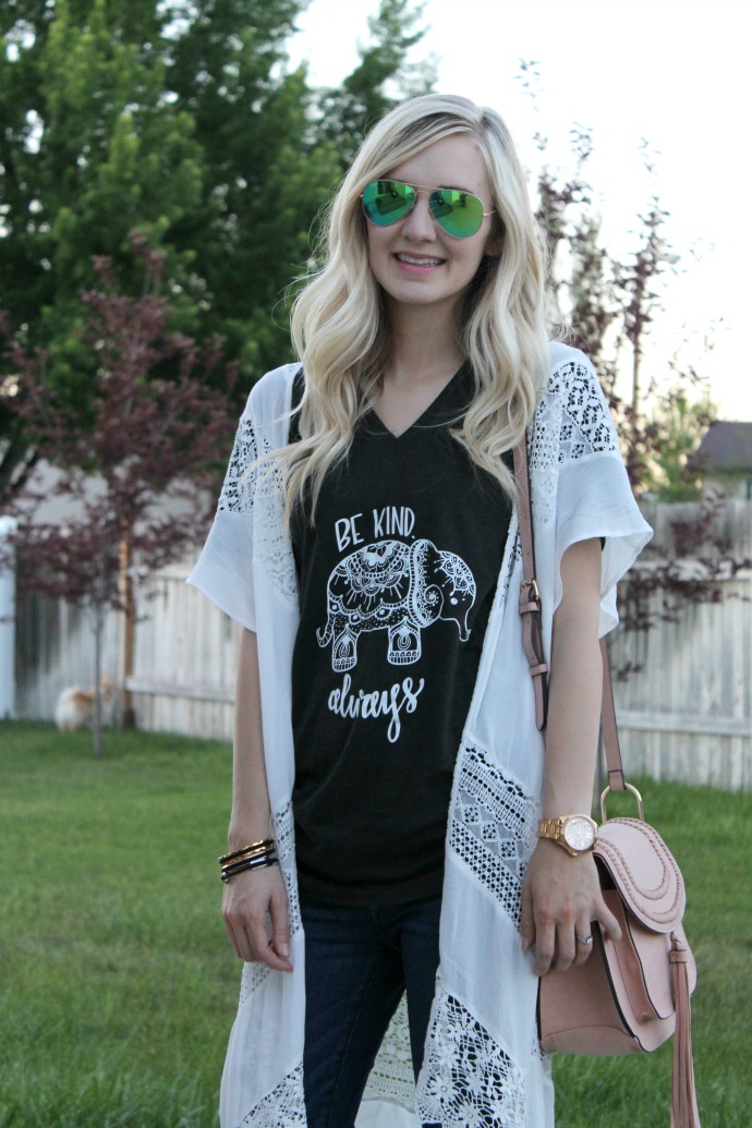 ‘be kind always’ tee c/o The Blue Envelope // bangles c/o Bela Bracelets // Fossil watch // Abercrombie jeans // Sole Society espadrilles // Ray Ban sunglasses // Maurice’s kimono, found in store