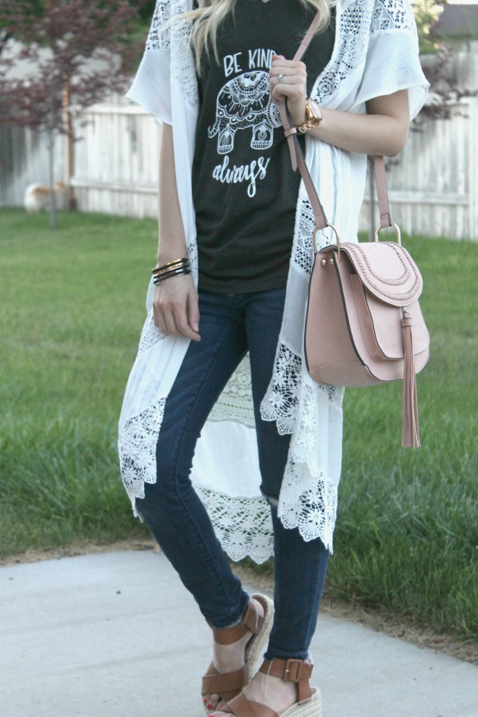 ‘be kind always’ tee c/o The Blue Envelope // bangles c/o Bela Bracelets // Fossil watch // Abercrombie jeans // Sole Society espadrilles // Ray Ban sunglasses // Maurice’s kimono, found in store