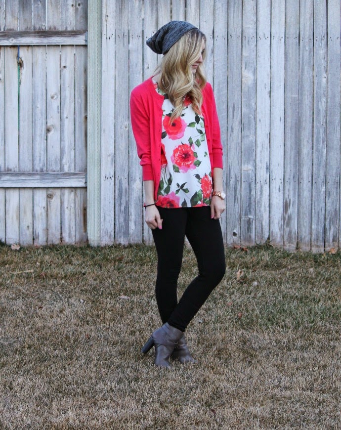 Bohme floral tank, old (more florals I’m loving linked below) // J.Crew Factory cardigan // VS Pink leggings // Sole Society booties, last year // Fossil watch // Grace Adele necklace // VS Pink beanie