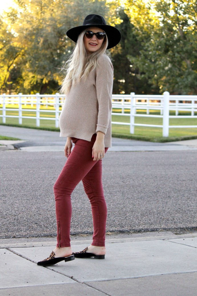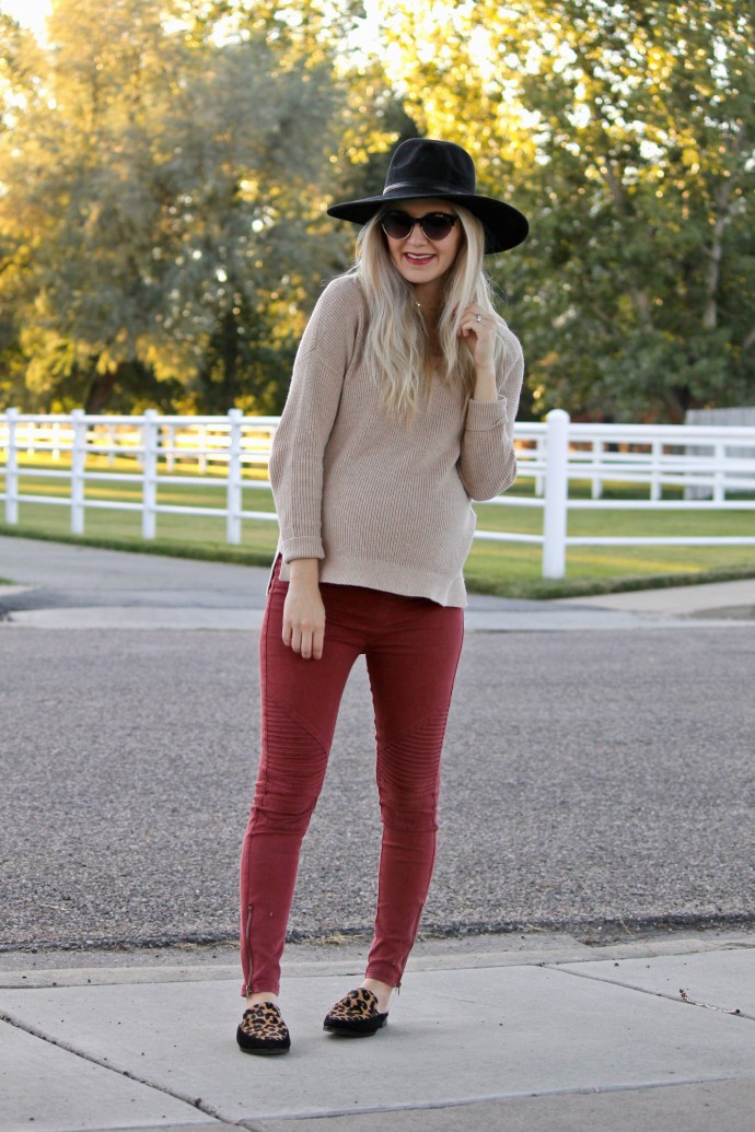 hat, asos old, similar here // abercrombie sweater // boutique moto leggings // leopard mules // necklace // sunglasses // lipstick