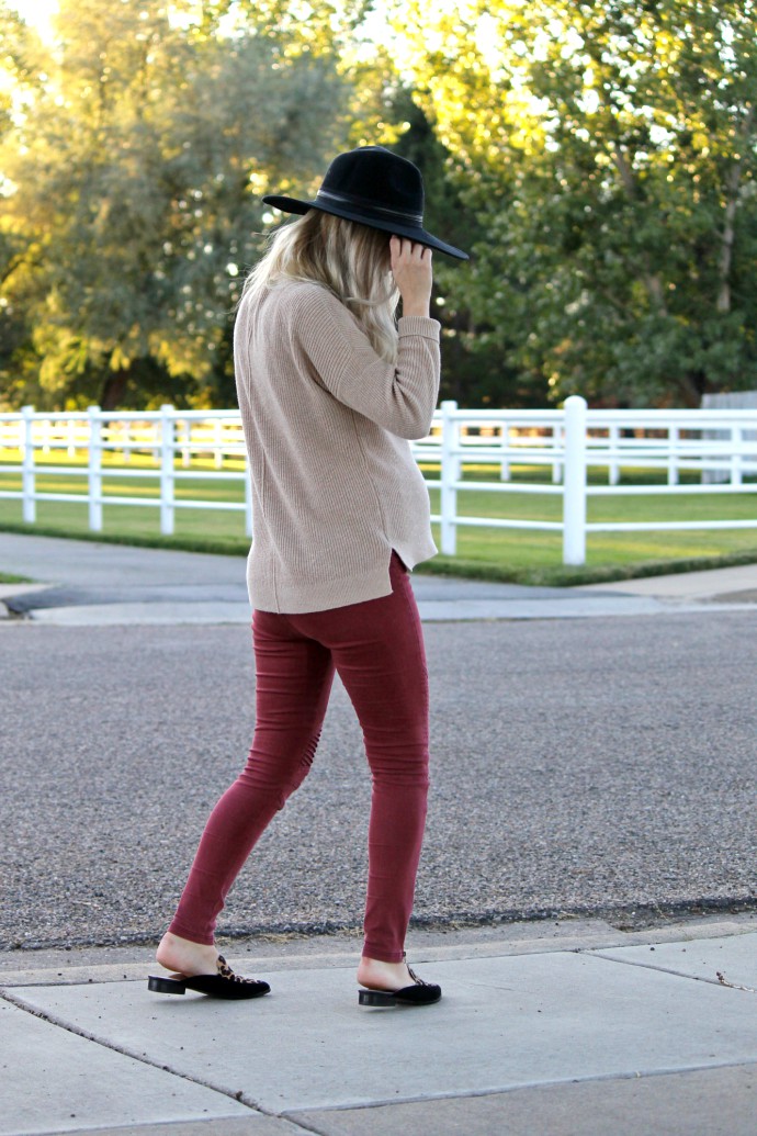 hat, asos old, similar here // abercrombie sweater // boutique moto leggings // leopard mules // necklace // sunglasses // lipstick