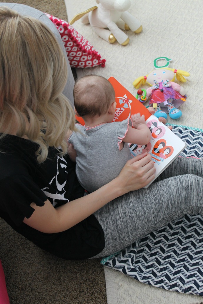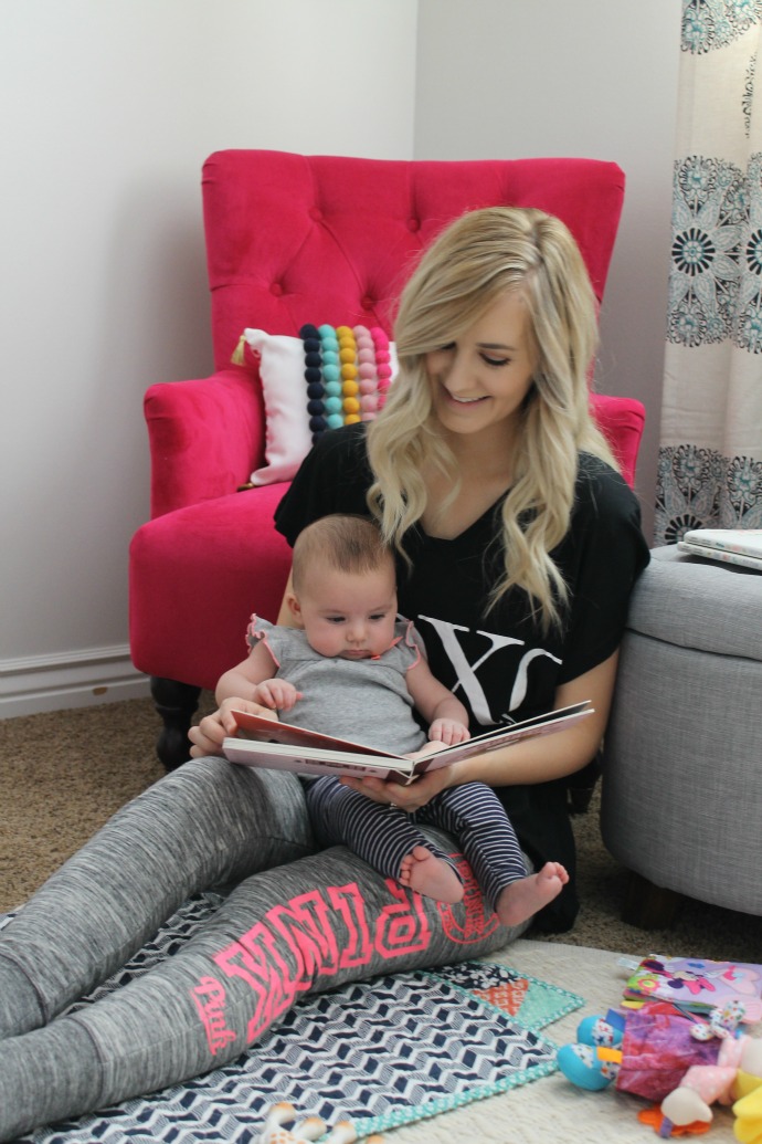 Navi is our little bookworm. We can read for hours and admire the pictures and she even tries turning the pages. I have not read much since jr. high and so it’s fun to see her love of books grow as she’s getting smarter and understanding more. There are days in the week when seriously I don’t feel like getting ready or doing much so sweats it is, and toys and books are the focus in our house.
