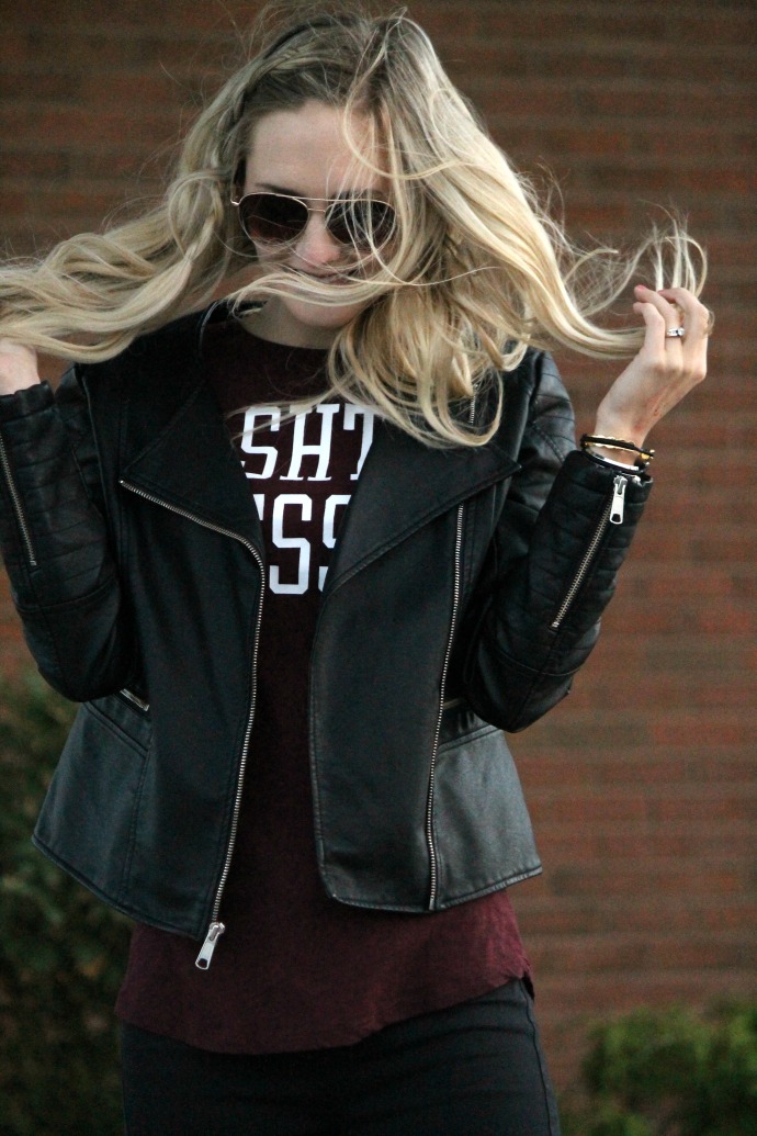 Kohl’s moto jacket, old // Bohme moto leggings // VS Pink tee, old // Halogen flats // Lipsense lipstick “bella”