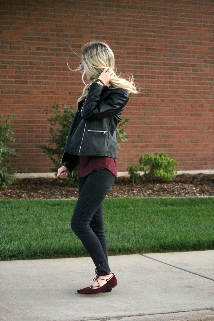 my look today is simple. black, bordeaux and a bit of moto π I don’t wear my faux leather jackets too often, partially because I don’t feel like I’m edgy enough to truly pull them off – and then other times (like in this case) I wonder why I don’t wear it more often?! I mostly wear black at work so I rarely want to wear black on my days off – but these colors were meant for each other! I love the tough, sassy vibe that is this outfit.