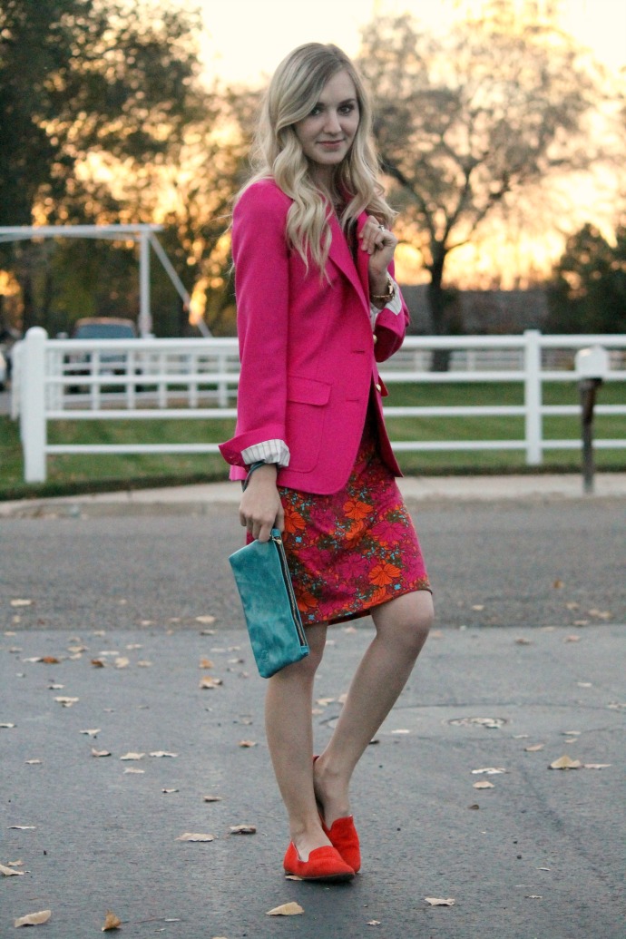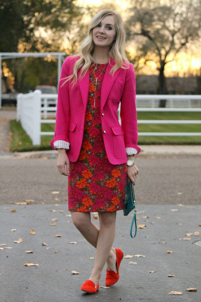 I could’ve toned down this dress with some neutral booties and a denim jacket but I thought ‘why not go bold?!’ and just went for an entirely pink and orange ensemble – with a beautiful pop of turquoise in my clutch π I LOVE wearing color and I have been saving this gorgeous J.Crew blazer for the perfect day, and this fun floral printed dress was an instant must!