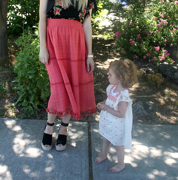 Navi was killing me in this adorable little dress, the details embroidered on are the exact color match to my skirt so you know we just HAD to coordinate our looks?! π with undone hair, no shoes, we are ready for those long summer days! we don’t go to bed until 10:30 or later π it’s just too nice outside to stop playing! and this bump you guys! I feel like it just keeps showing up out of nowhere. I felt like I had like nothing and then now I feel like a basketball (and it’s only going to get worse π haha) I’m almost 22 weeks and already feel a little ahead of the game with all the baby clothes washed, starting to organize the girls’ closet and (working on) picking out a name. usually I procrastinate until the end on everything but I just want to be prepared this time!