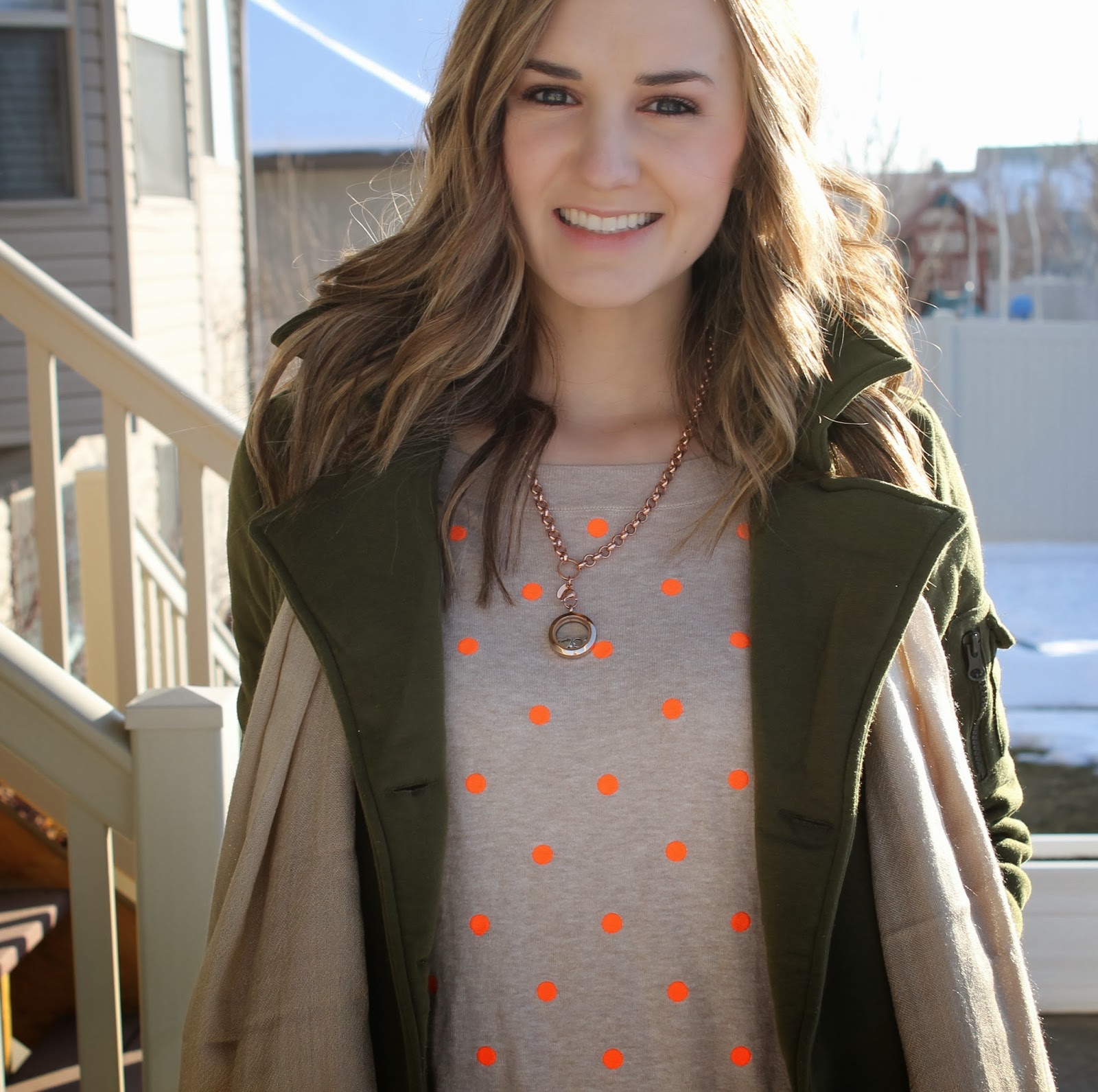 more chilly days call for arm warmers and scarves! um… does anyone else think all I do is wear scarves? it’s okay to be honest. I just LOVE them! they add the perfect finishing touch to an outfit π I love my origami owl necklace! it’s a locket that has little charms that represent different things about your life π it’s such a beautiful accessory and it means so much! I needed some brightness happening… so polka dots & stripes in orange and pink was the solution.