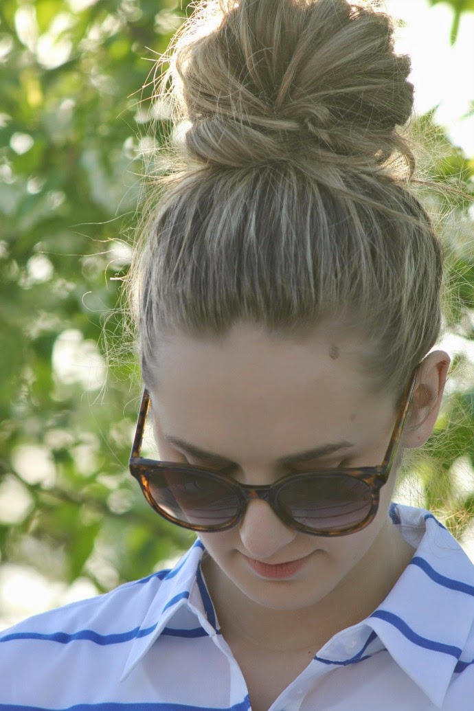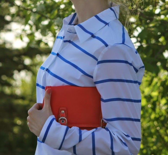 top, Kohl’s | skirt, J.Crew Factory, same fit | flats, J.Crew Factory, other options | sunglasses, Target | watch, Fossil | clutch, coral, Grace Adele