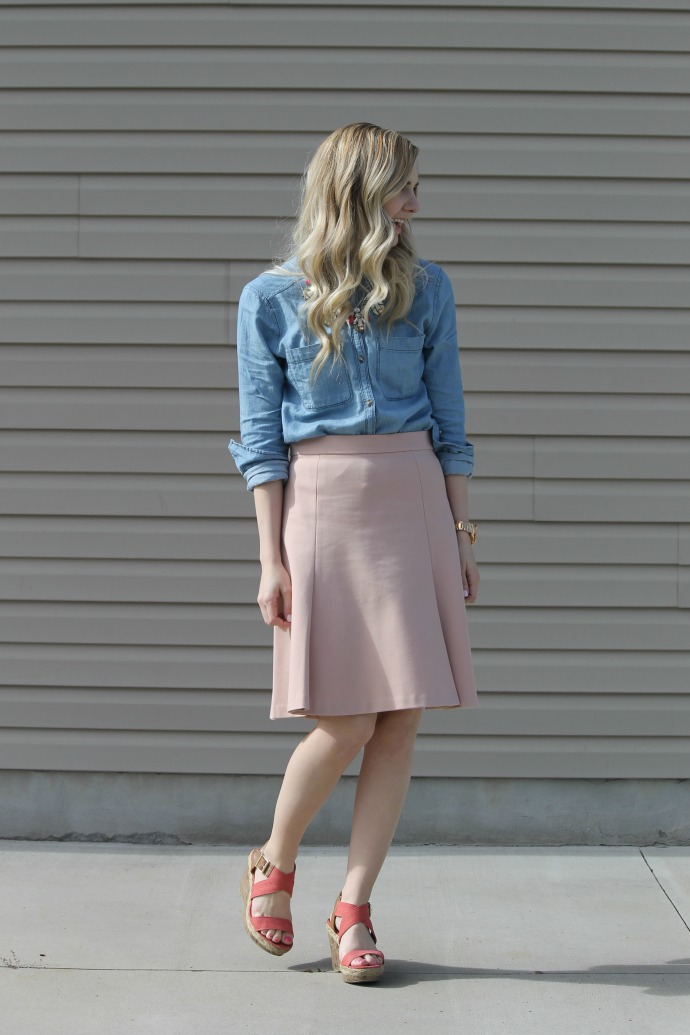 Hollister chambray top // Joann necklace // Target wedges, old // J.Crew skirt (last year) // Fossil watch