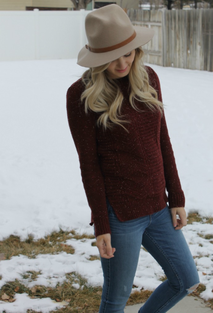 Hollister sweater (I’m in an XS) // Abercrombie denim (I’m in a 26 short) // Franco Sarto booties // Billabong hat via Bohme