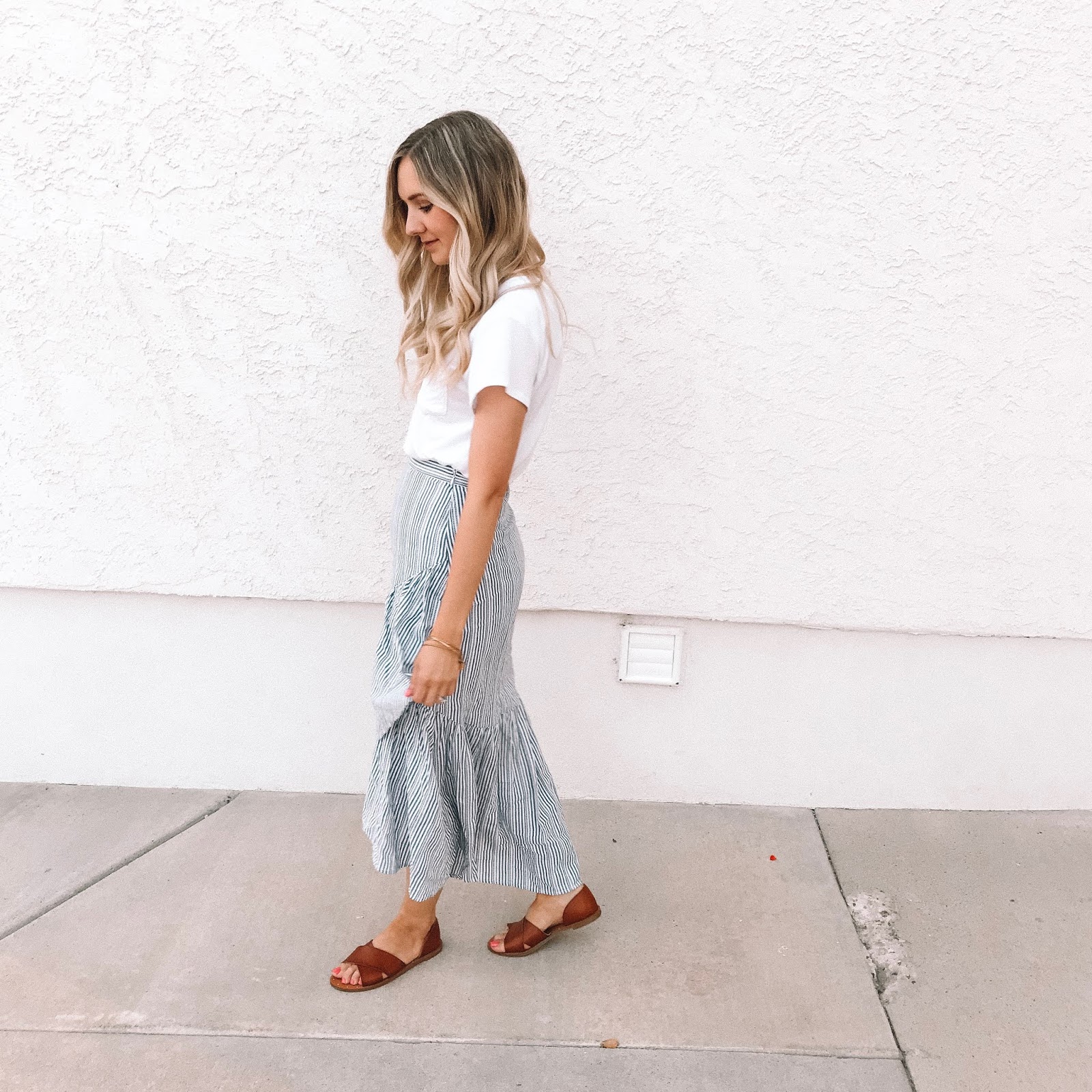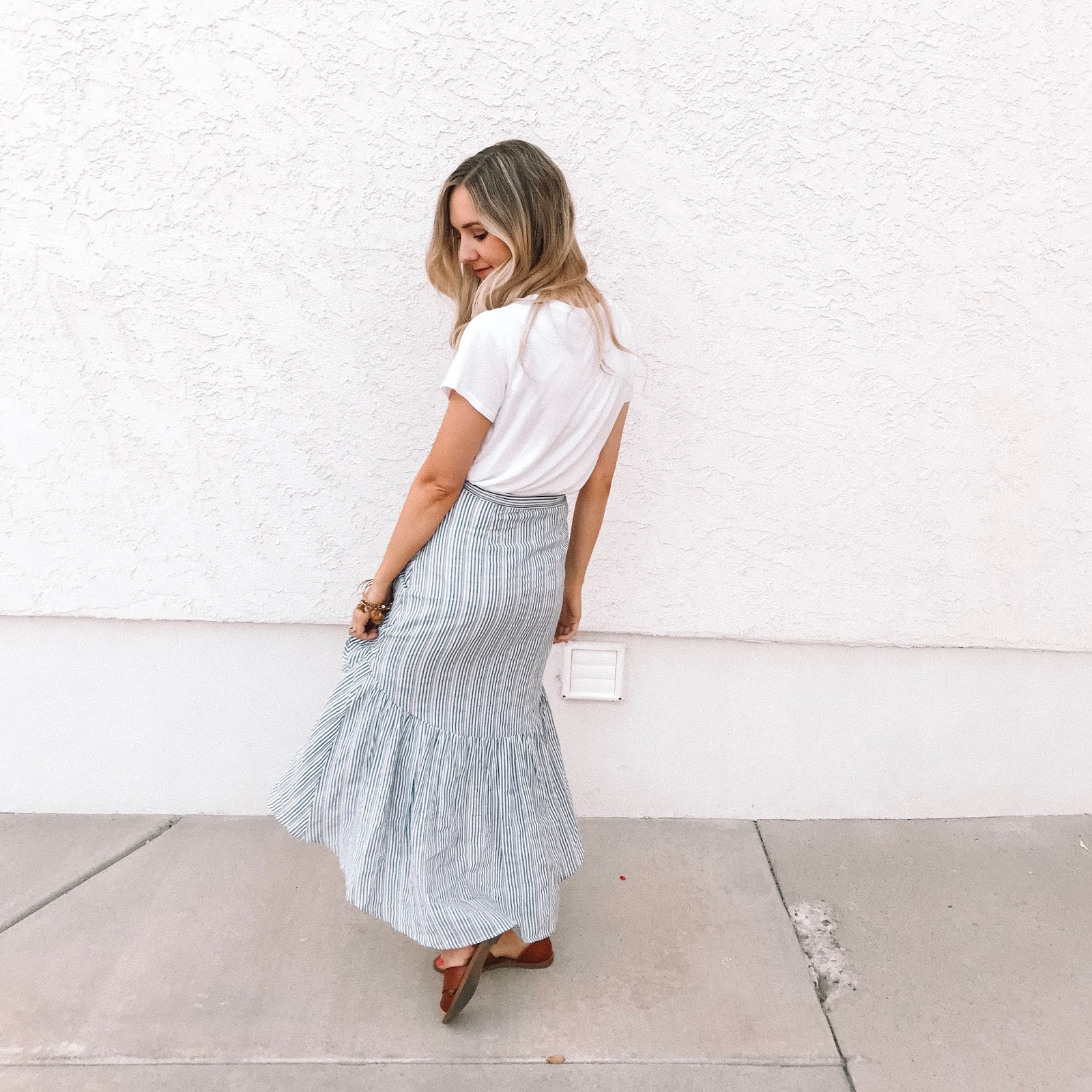 this skirt is a literal dream you guys. I’m SO in love with it. it’s the prettiest lightweight fabric and honestly hugs me in all the right places. I feel so dang pretty in it. I am a preppy girl in spirit and a classic blue and white stripe is my go-to for basic wardrobe items. so combine a cute stripe with a ruffle high/low maxi and I’m all in!