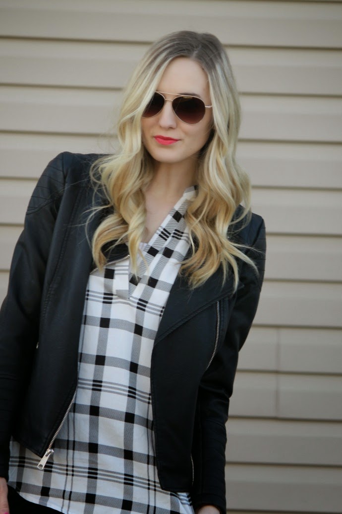 checked blouse c/o Hope Avenue // VS Pink leggings // Fossil watch // Franco Sarto boots // Target sunglasses, similar // Kohl’s faux leather jacket // Grace Adele bag