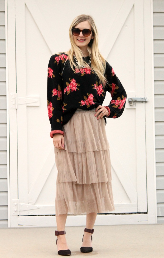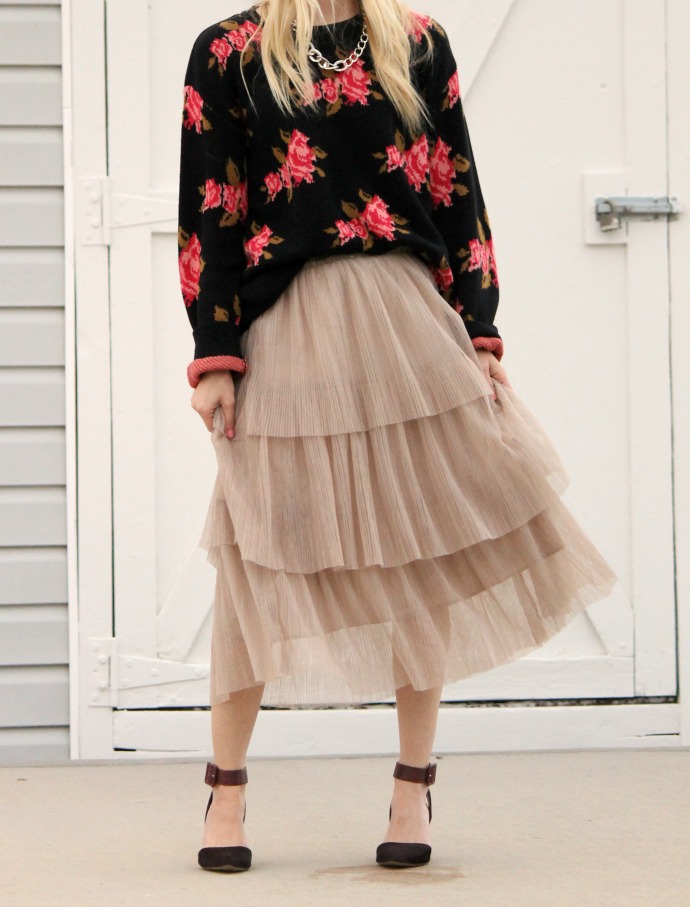 sweater thrifted c/o Uptown Cheapskate // tulle skirt, Jen and Syd Shop Stevie (now on sale!) // Sam Edelman heels, old // chain necklace, old // Target sunglasses, old