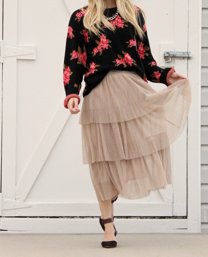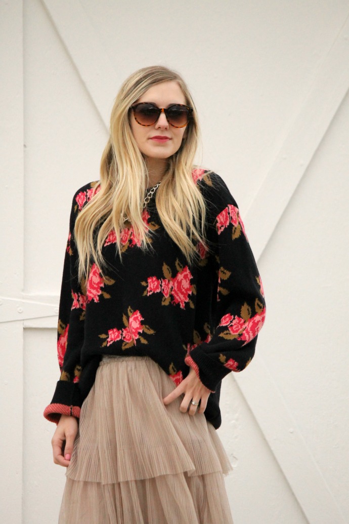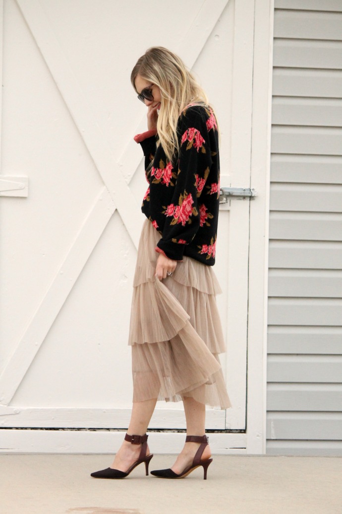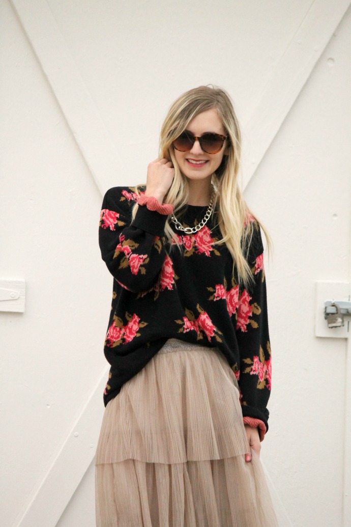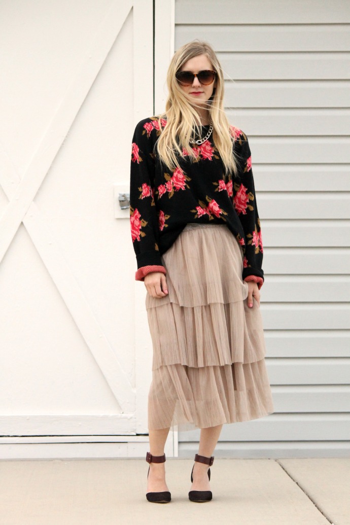 sweater thrifted c/o Uptown Cheapskate // tulle skirt, Jen and Syd Shop Stevie (now on sale!) // Sam Edelman heels, old // chain necklace, old // Target sunglasses, old