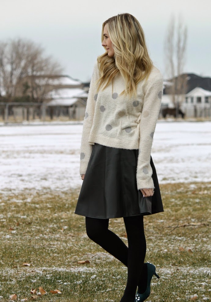 I wore this outfit to church and I actually ended up matching one of the sweet young women in our ward (she must have got the memo for a polka dot sweater, black flared skirt and black tights π as most of my followers already know or if you’ve seen some of my outfits, I like mixing and matching colors, styles and even textures. today’s look is no different. I just LOVE this ultra soft sweater with the edgy look of the faux leather skirt. I think a faux / leather skirt is a must have in anyone’s wardrobe because you can dress it up, wear it casually and it can so easily become feminine and classy! give it a try! swap out your plain black skirt for a faux leather black skirt this year for a fresh new take on black π if you’re already loving the faux leather skirt, try it in a fun color! I’m thinking navy or pink for myself π