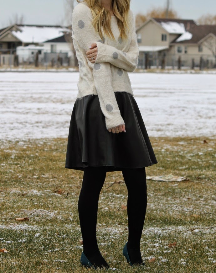 I wore this outfit to church and I actually ended up matching one of the sweet young women in our ward (she must have got the memo for a polka dot sweater, black flared skirt and black tights π as most of my followers already know or if you’ve seen some of my outfits, I like mixing and matching colors, styles and even textures. today’s look is no different. I just LOVE this ultra soft sweater with the edgy look of the faux leather skirt. I think a faux / leather skirt is a must have in anyone’s wardrobe because you can dress it up, wear it casually and it can so easily become feminine and classy! give it a try! swap out your plain black skirt for a faux leather black skirt this year for a fresh new take on black π if you’re already loving the faux leather skirt, try it in a fun color! I’m thinking navy or pink for myself π