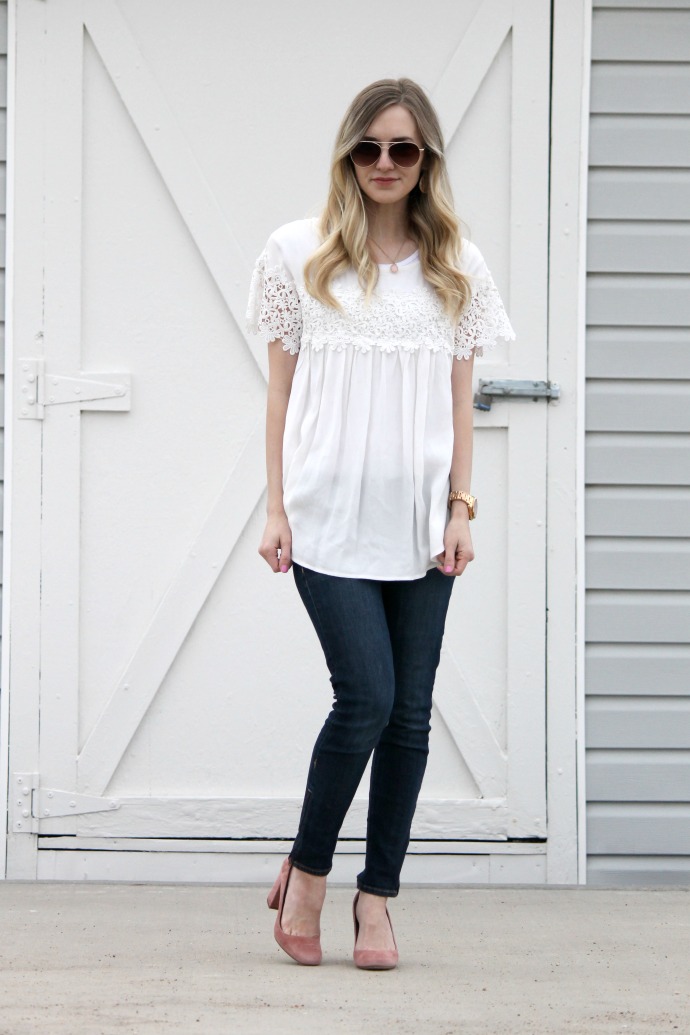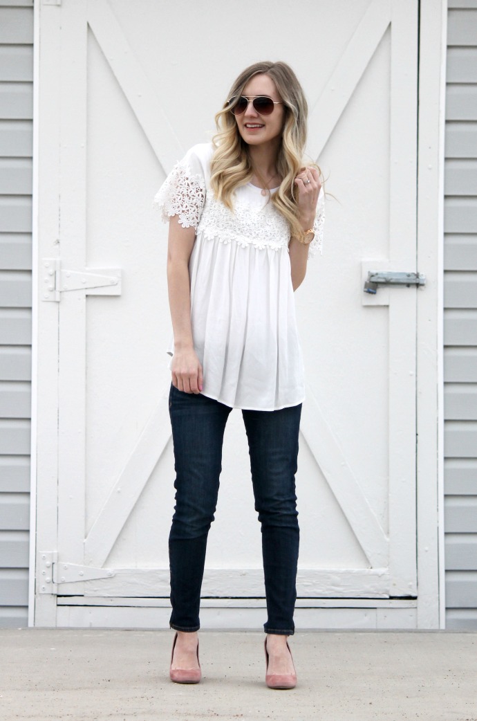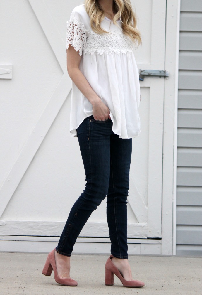 I walked down my stairs in this outfit just feeling so happy about it. you know those looks when you just feel like yourself? that’s this outfit for me. a cute top, simple jeans and some pink heels. boom. me. I even told my husband, ‘dang, I should wear this outfit again, it’s totally my style’. sometimes I get dressed and feel just so confident and happy with what I’ve got on π I used to dress in a fun tee and jeans and jazz it up with heels – Nash loved outfits like that. so it’s my quest to be sure I switch it back to the ‘good old days’ and what I’m most comfortable in every now and again π