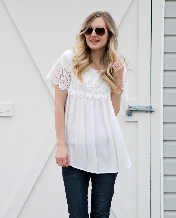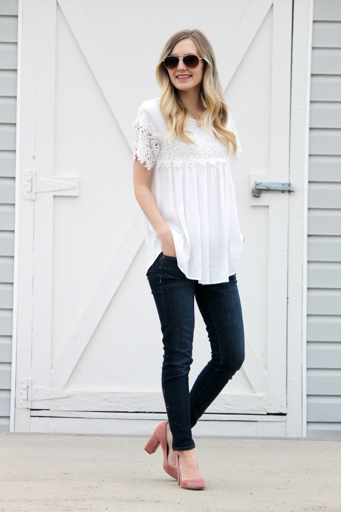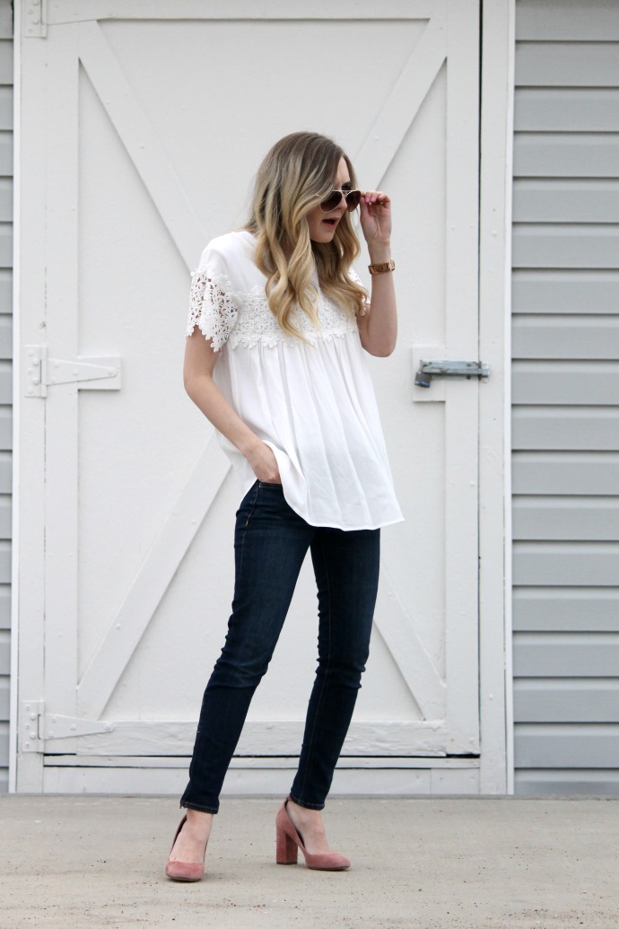 I walked down my stairs in this outfit just feeling so happy about it. you know those looks when you just feel like yourself? that’s this outfit for me. a cute top, simple jeans and some pink heels. boom. me. I even told my husband, ‘dang, I should wear this outfit again, it’s totally my style’. sometimes I get dressed and feel just so confident and happy with what I’ve got on π I used to dress in a fun tee and jeans and jazz it up with heels – Nash loved outfits like that. so it’s my quest to be sure I switch it back to the ‘good old days’ and what I’m most comfortable in every now and again π