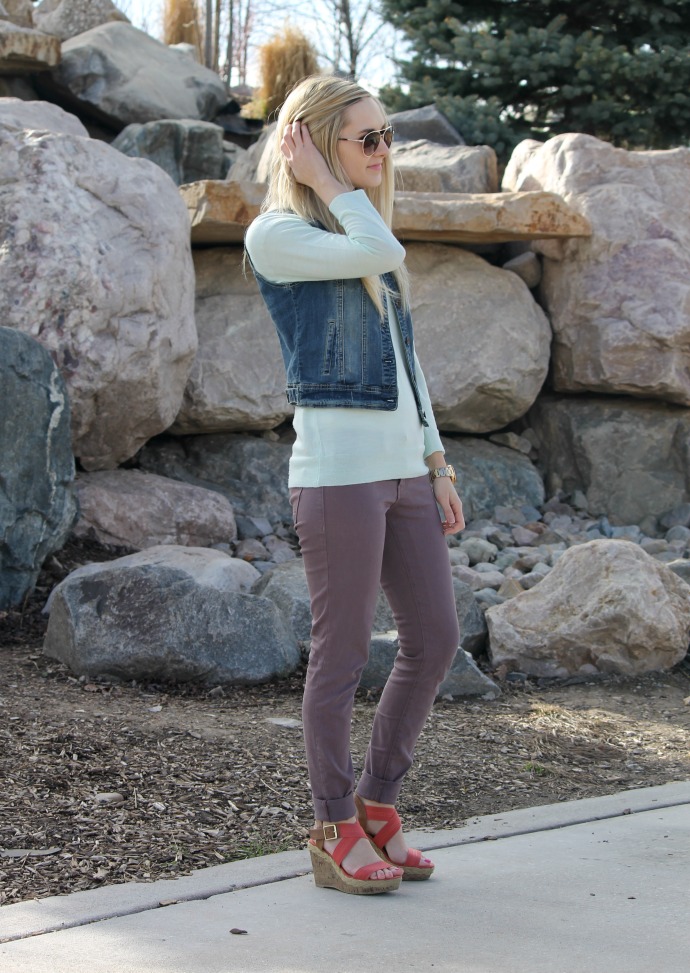 I love to wear lots of color, especially together. This look though I felt, needed something a bit more than just the solid top, solid pants and solid shoes … a denim vest! typically I wear denim as my pants but where I opted for a dusty purple shade instead, a little bit of denim pulls the whole thing together. denim keeps the look grounded and cohesive.