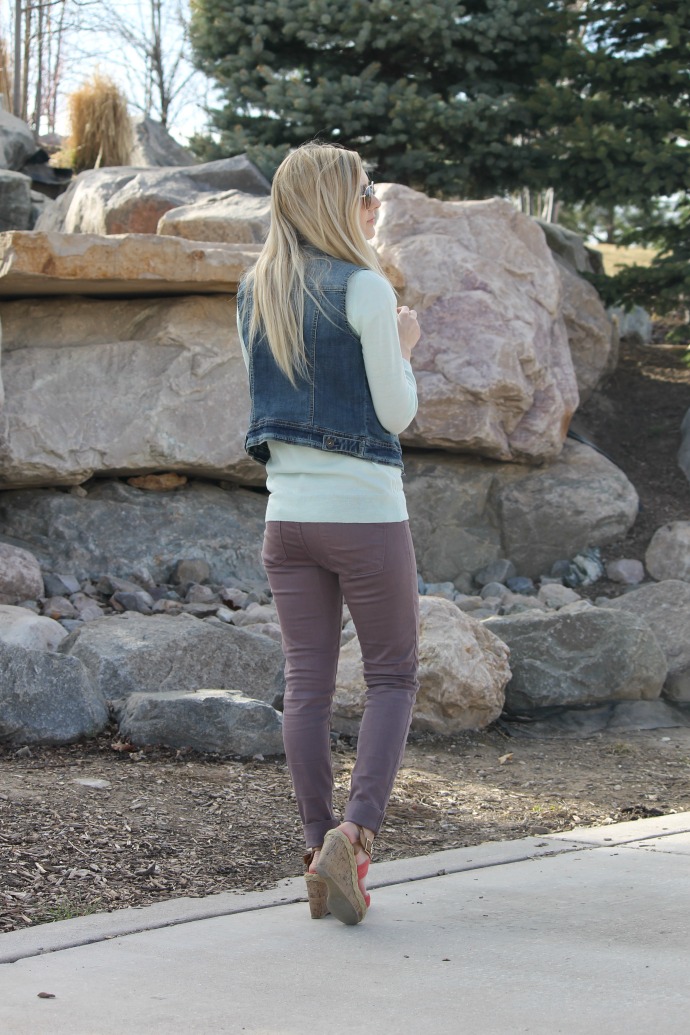I love to wear lots of color, especially together. This look though I felt, needed something a bit more than just the solid top, solid pants and solid shoes … a denim vest! typically I wear denim as my pants but where I opted for a dusty purple shade instead, a little bit of denim pulls the whole thing together. denim keeps the look grounded and cohesive.