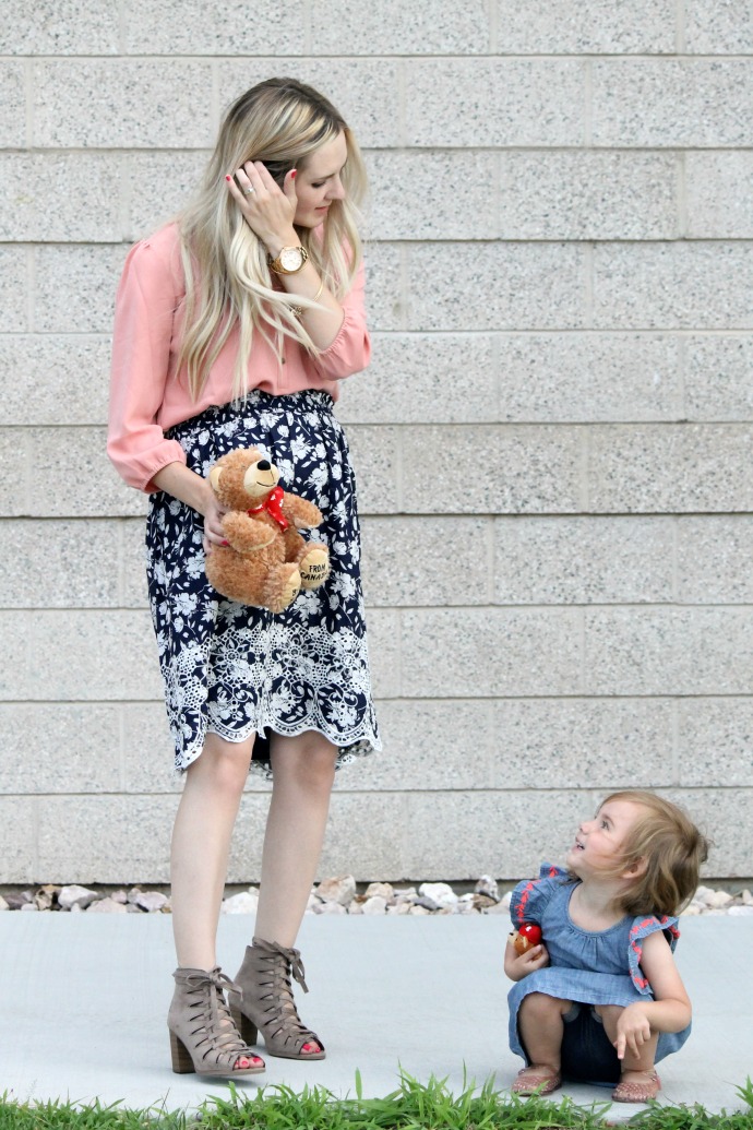 today’s look I wore to church this past Sunday and it was comfortable enough to chase my active little girl around in, but I still felt so stylish and on trend! this beautiful coral/pink blouse has the prettiest sleeve and neckline details – I know this top will be a staple in my wardrobe for any season. You guys all know me and my love for floral prints π and this skirt is no exception, it truly is one of my favorite things in my closet right now! and how fabulous that it fits right over my baby bump π I love being able to wear things for maternity wear that aren’t necessarily labeled that way.