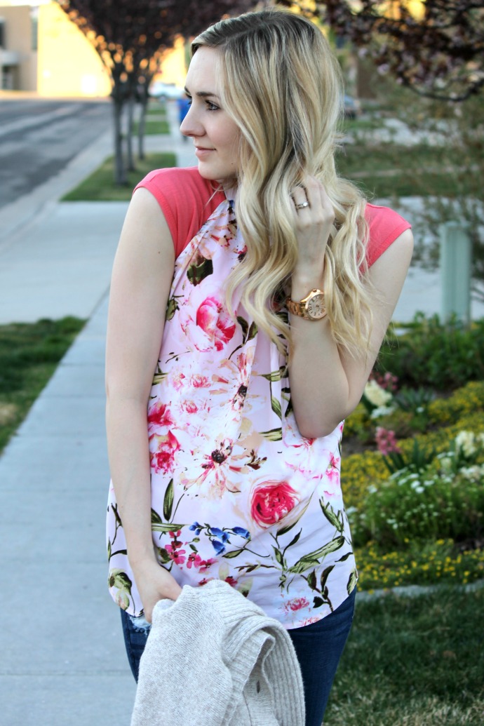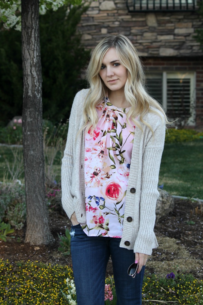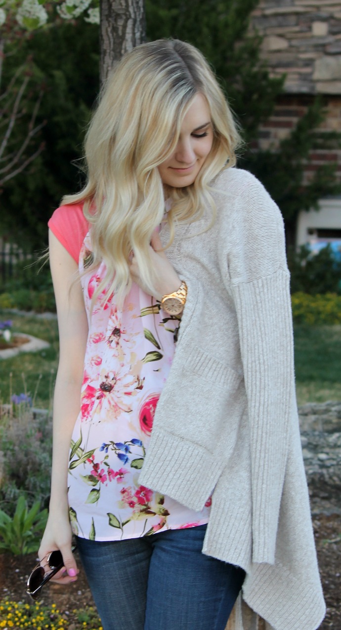 This is a great transitional look. I love the coziness of the sweater mixed with the floral top, so cute!-Jessie @ Midwest Bride