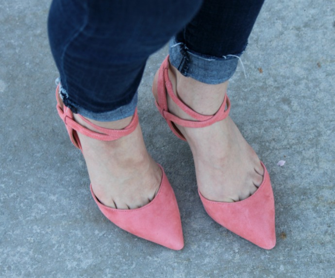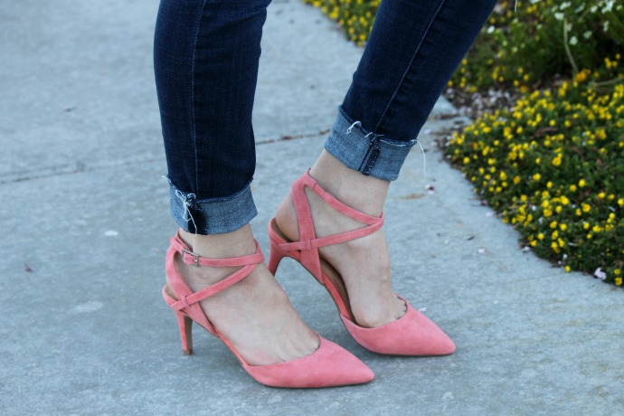 and if you’ve noticed I have more shoe close ups than before … because these are like spring vibes all the way!!!!! they’re so pretty (they did give me teeny blisters on one foot though because of rubbing, if the toes were stuffed I wouldn’t have this issue, my left foot is wider than my right, so what’d’ya do? π ;P I’ve worn them a few times now and I’ve learned that if I don’t let my toes crawl their way into the toe area – I get zero rubbing and they’re perfect! so if you don’t mind some toe cleavage this heel is the perfect option for you!