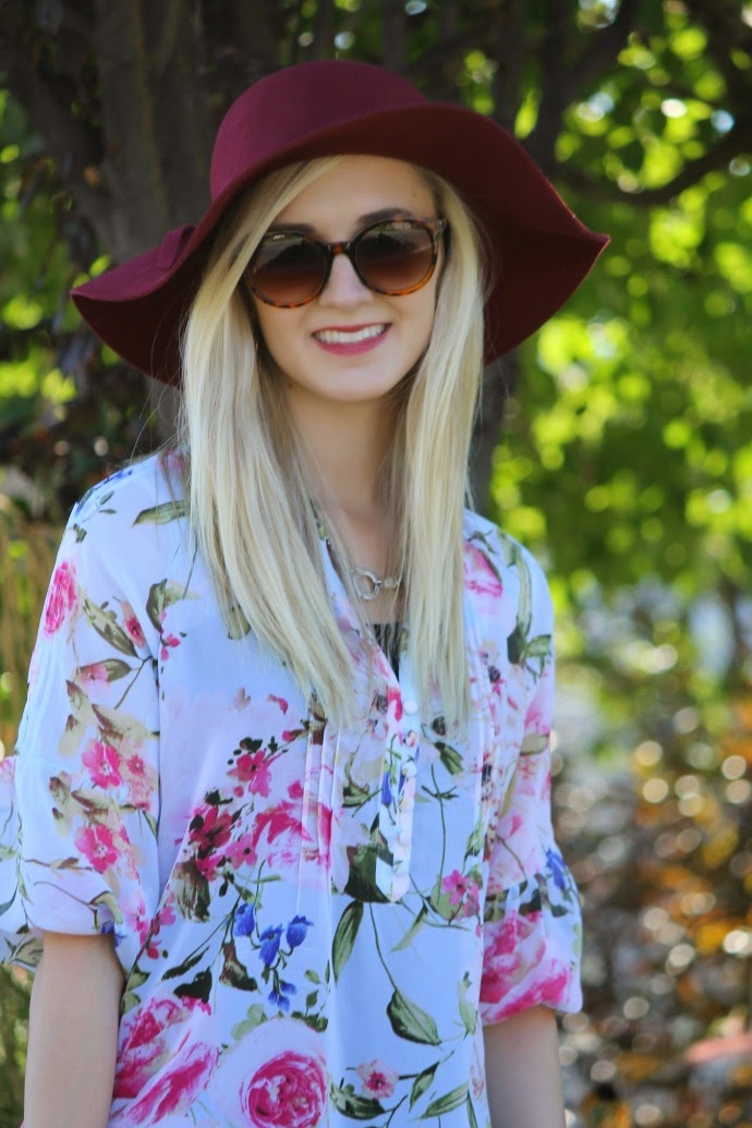 one of the biggest trends is wearing floral prints in fall. especially lighter colored, pastel, very feminine floral prints, I kept my outfit fresh and bright wearing my pale pink flats and cream bag, yet added a pop of a signature fall shade, maroon/burgundy. an accessory and in lipstick are two easy ways to bring a fall flair to a more summery outfit.