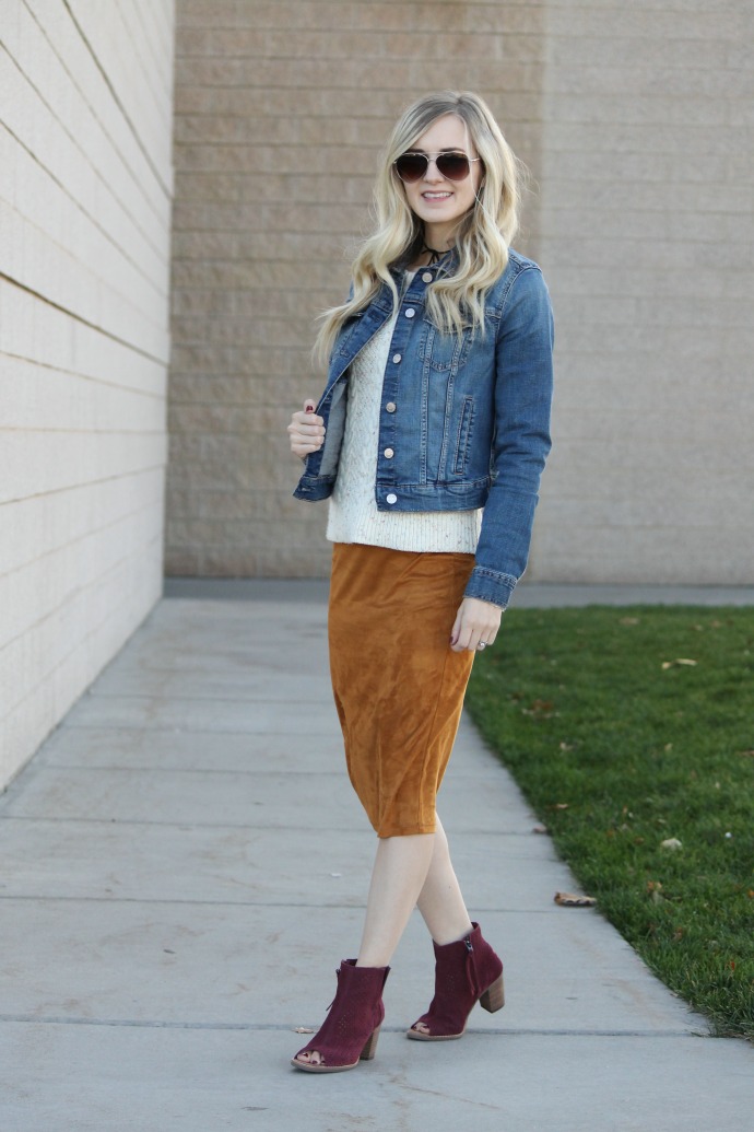 I’m really excited about this fall look today π I teamed up with Wight Gold, (website here) to share how I styled their beautiful suede pencil skirt! I love being bundled up for the cooler weather but I still want to be stylish. Suede is one of my favorite textures for clothing/shoes/etc. and this skirt is seriously so pretty. it pairs so perfectly with another rich fall shade, burgundy and as accents to the cream sweater and denim jacket, this look is neutral but still says ‘FALL’ which I totally love!