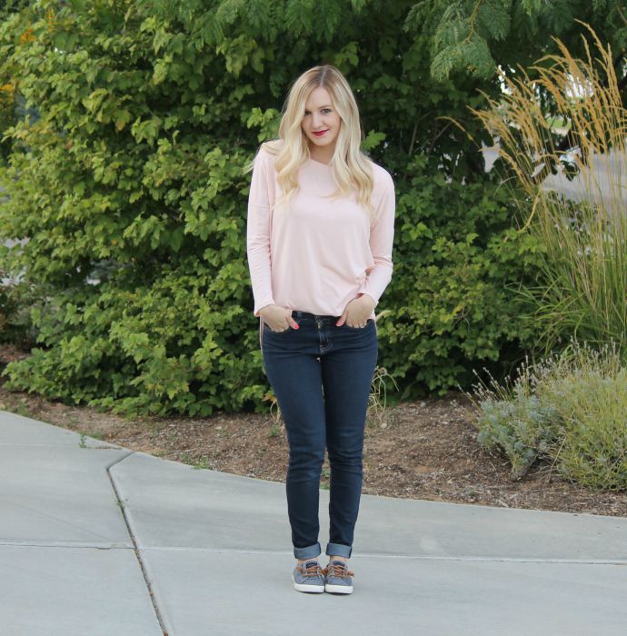 blush top c/o Hope Avenue (found in store) loving this shirt // Flying Monkey denim via Bohme // Sperry top sider sneakers // lipstick (a combo of these three … Rimmel Kate Moss #107 , Covergirl # 360 and VS gloss in All Yours)