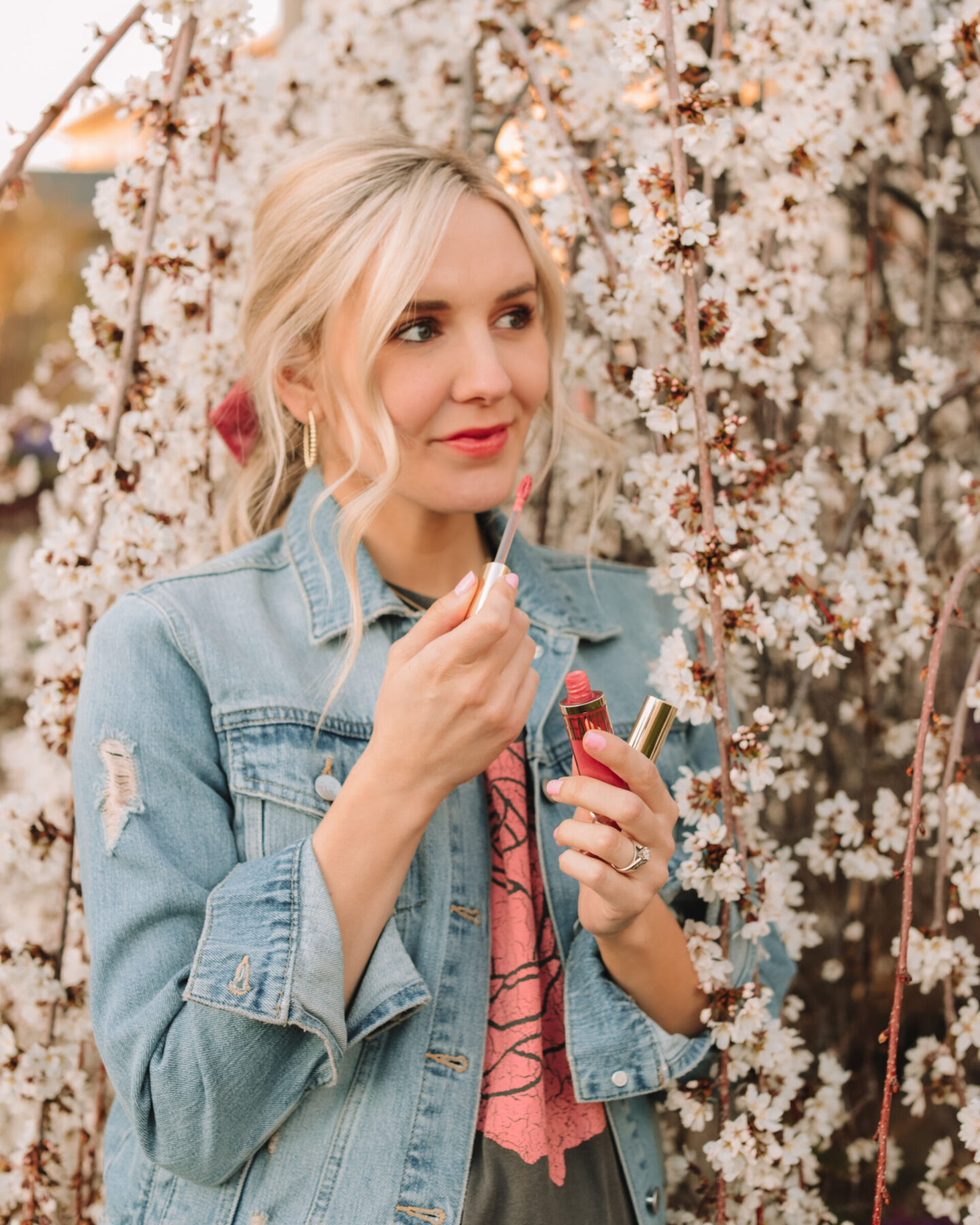 this gorgeous tree in my parents’ backyard makes me happy and every year I try to do pictures in front of it at least once – the blossoms are BEAUTIFUL! and girl – if you haven’t tried this beyond gloss – what are you doing??!! lol but seriously, it’s THE BEST lipgloss. stunning colors, non stick – read more here in this post
