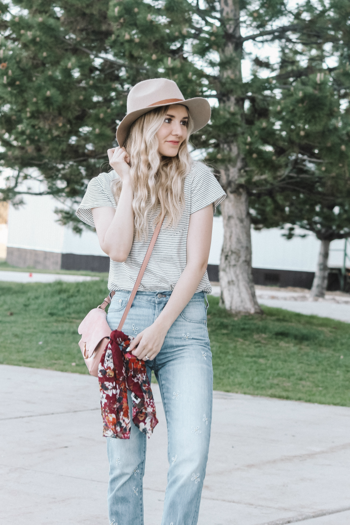 I titled this blogpost ‘madewell vibes’ because if you didn’t know any better, you may assume my entire outfit was purchased there. I like doing that when I’m shopping. buy clothes that ‘look the part’ or have the same style as another popular or trending retailer. my shoes for example totally have the look that they are either Free People or Madewell – but they’re less than $25 from Target! my hat I got a few years ago from Roxy, and my tee is Albion Fit. finding staple wardrobe pieces like a neutral hat and a striped tee will take your everyday looks and elevate them. they are classic items that can be worn so many different ways and will really be useful in your day to day style.