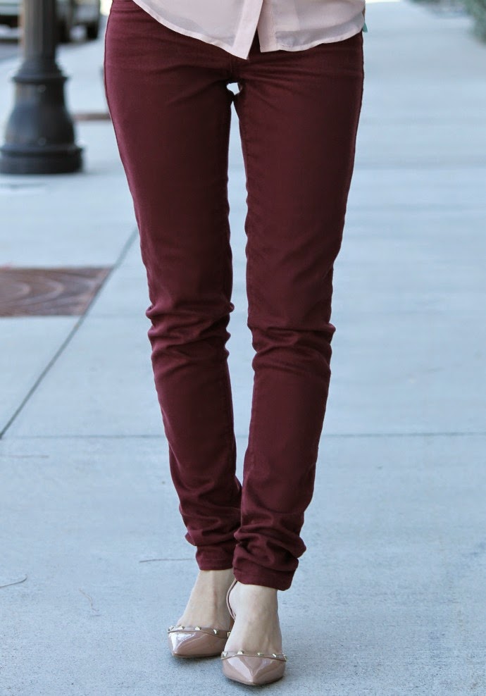 this outfit is the first of three in this mini series showing how I love to style my burgundy jeans. today I chose to do some color blocking, keeping the outfit simple yet feminine. I love how the blush blouse looks with the darker red jeans. π (smashing combo I think) tune in later this week to see the other two looks featuring these Flying Monkey jeans from Bohme.