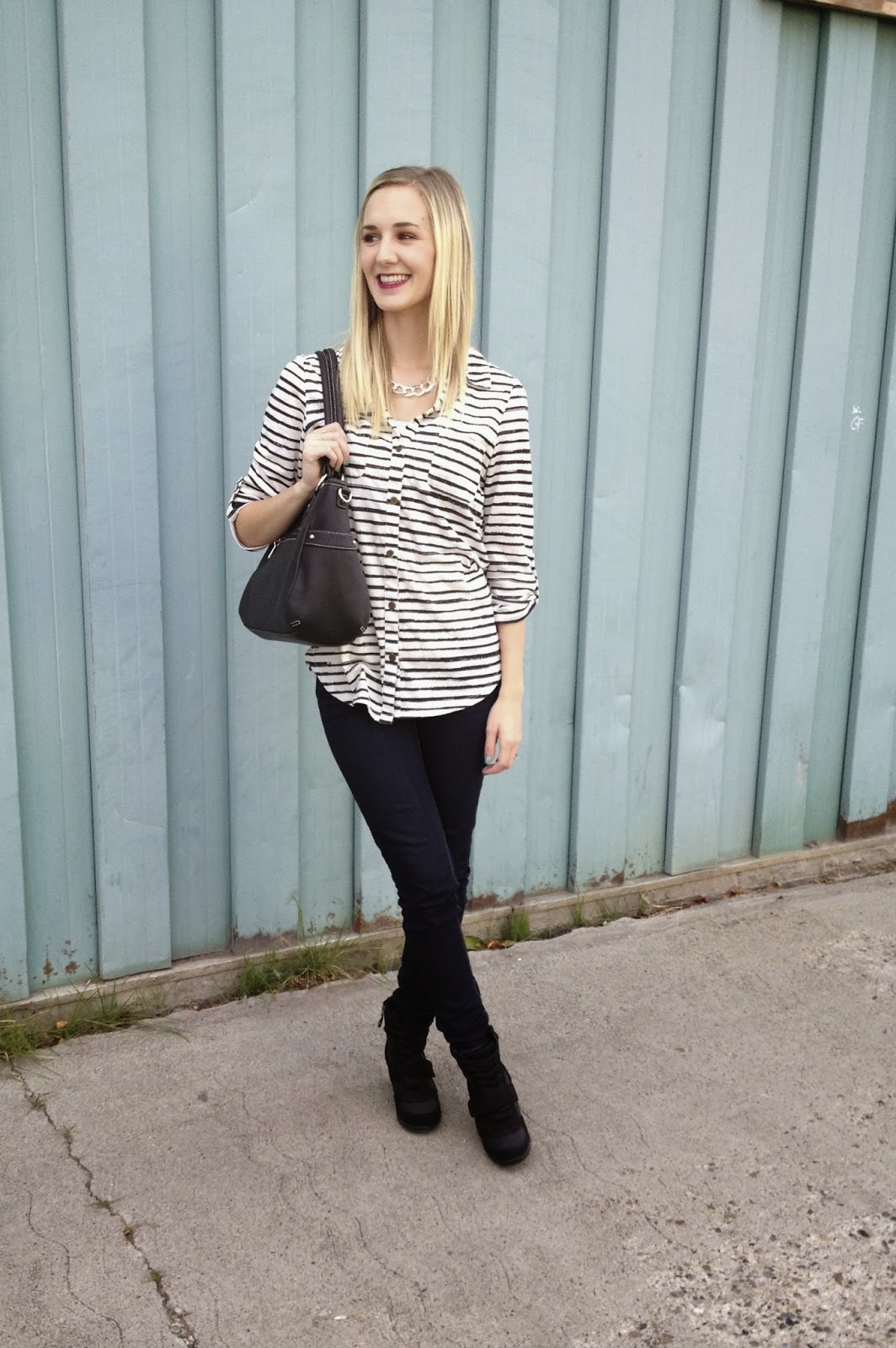I am loving the bold, dark lip trend and in honor of our favorite bombshell, Marilyn Monroe, I sported it. (How cool is that piece of art?? I found it just on the side of a building). Even with such a casual look, the lip adds just enough jazz to make it a little more special. Black and white are HUGE trends this fall, and I’m obsessed. I’ve never been a fan of black, but I find I keep adding more and more into my wardrobe. My purse and necklace are Grace Adele and it is actually hard to not want to wear this necklace with -every- single outfit! It goes with anything, that’s why I love it.