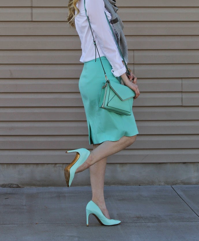 Hollister blouse (old) // Burberry scarf // J.Crew skirt (last year) similar linked below // Fossil watch // Rebecca Minkoff bag (last year), same style here, clutch style here // Ted Baker heels (score from Nordstrom Rack), other colors here