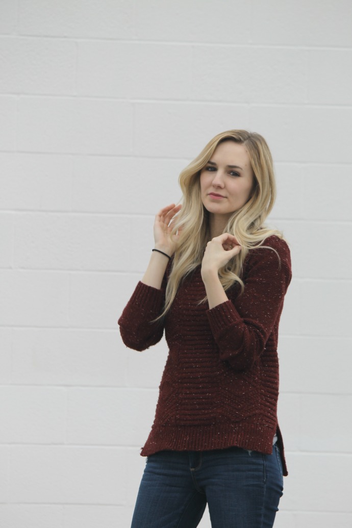I’m so over the cold weather π and luckily, we’ve had some nice days (inbetween some rainy and snowy ones) and so I haven’t had to wear a coat but have needed something a little warmer than just a tee shirt. I decided to layer a v neck under a cable knit sweater for a change. I think it looks super cute and adds that warmth I was looking for as well as dimension to my outfit. Layers are a great way to look more put together – even if the look is casual π