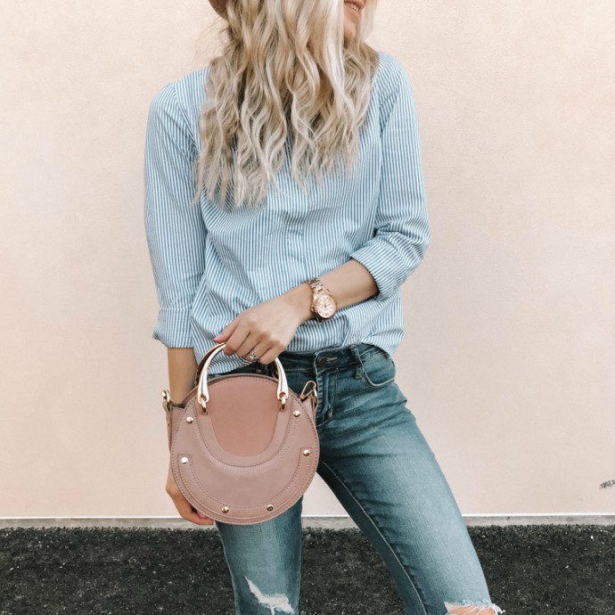 a bold bag and red shoes really switch up the look. I love it because blue and red is so patriotic and iconic – it makes me think of holidays and summertime fun!