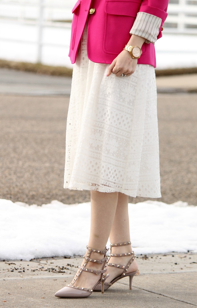 I’m really excited today about this outfit, I wore it a few weeks ago for church and just couldn’t get it out of my head .. I LOVE the hot pink with the white lace – what a combination! it’s so fresh and fun and I can’t wait to style more white as we’re coming into spring and summer!