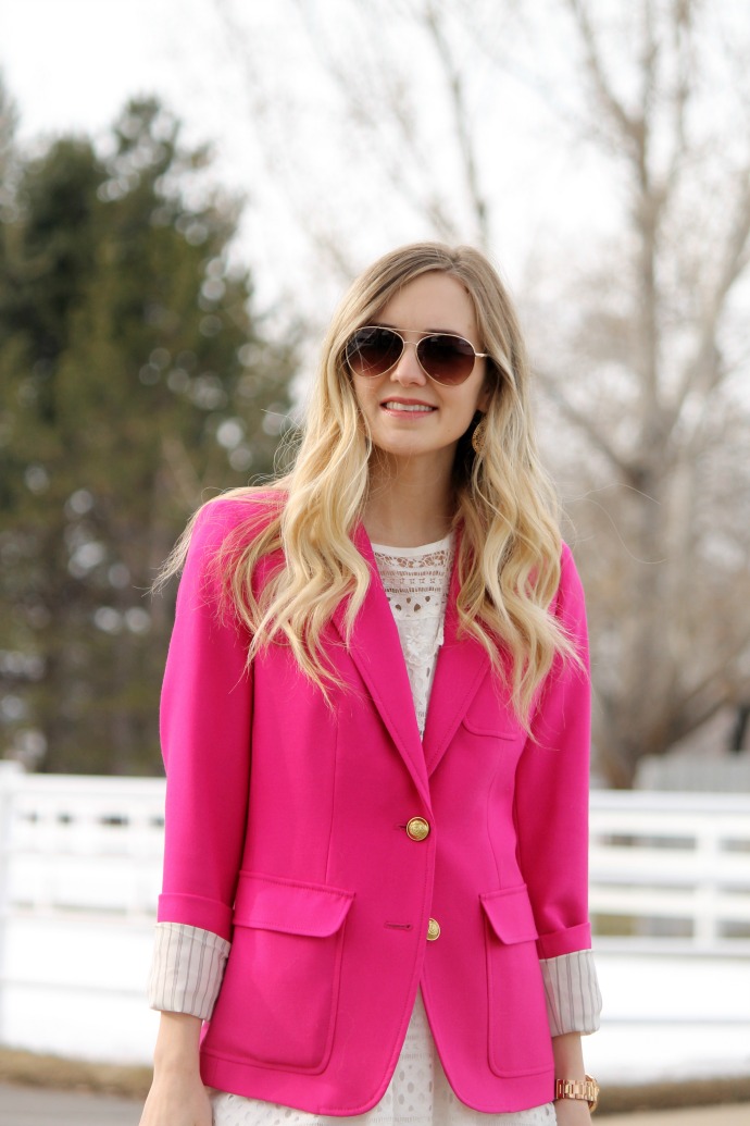 this blazer I bought last year at J.Crew but I paid FULL PRICE! I about died, but then it sold out so quickly, so I never looked back! I LOVE wearing it and I feel like it’s so perfect for my style and my wardrobe. every wardrobe needs that one statement piece that can be paired with any look, and in my closet, this blazer is that statement. hot pink isn’t a typical blazer color π but for me, being my favorite color, pink was the obvious choice.