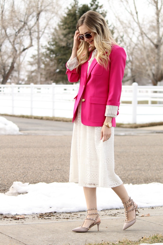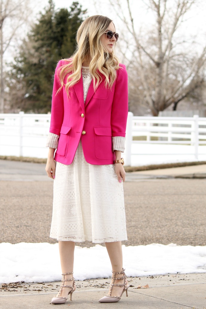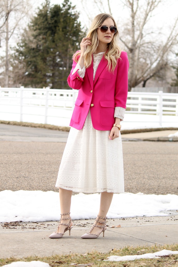 I’m really excited today about this outfit, I wore it a few weeks ago for church and just couldn’t get it out of my head .. I LOVE the hot pink with the white lace – what a combination! it’s so fresh and fun and I can’t wait to style more white as we’re coming into spring and summer!
