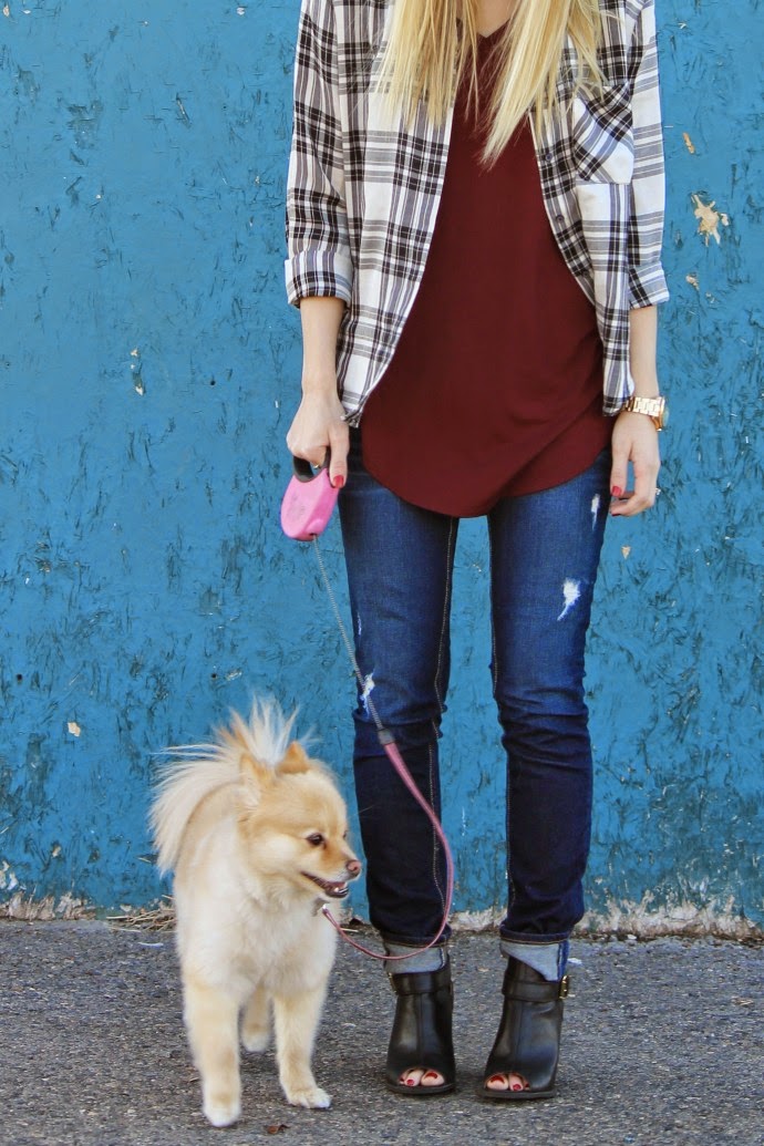 Forever 21 plaid button up (found in store) // burgundy tee via Bohme // Hollister jeans, old // Payless booties (on major sale!) // Essie polish in “forever yummy” // lipshade, Bare Minerals Marvelous Moxie lip liner in “jazzed” // Fossil watch