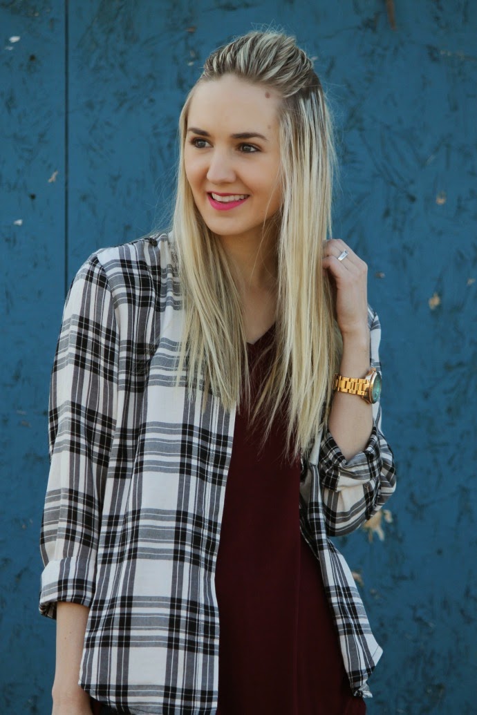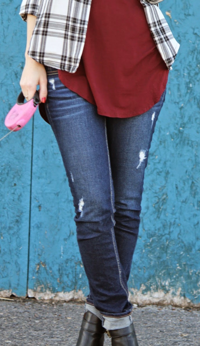 Forever 21 plaid button up (found in store) // burgundy tee via Bohme // Hollister jeans, old // Payless booties (on major sale!) // Essie polish in “forever yummy” // lipshade, Bare Minerals Marvelous Moxie lip liner in “jazzed” // Fossil watch