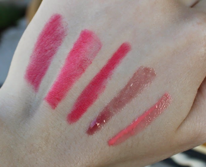 Milani hot pink rage // Maybelline shocking coral // Revlon unapologetic // VS rebel // NYX apple strudel