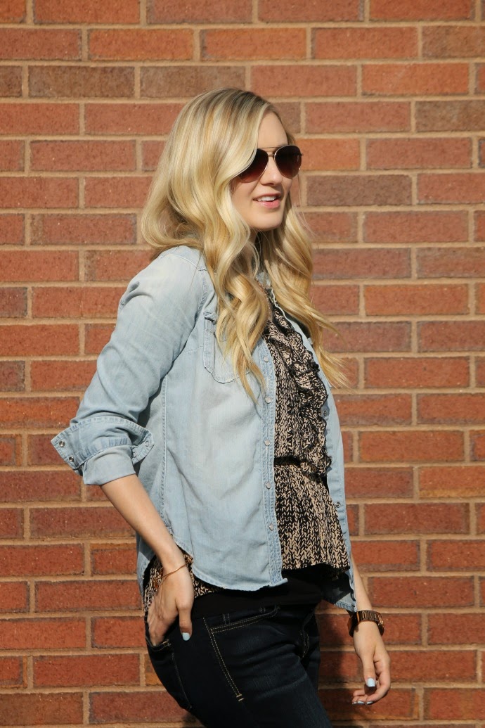 Hollister chambray top, old // Bohme flying monkey denim // Fossil watch // ruffled tank, old // necklace via Rocksbox // Alex and Ani bracelet