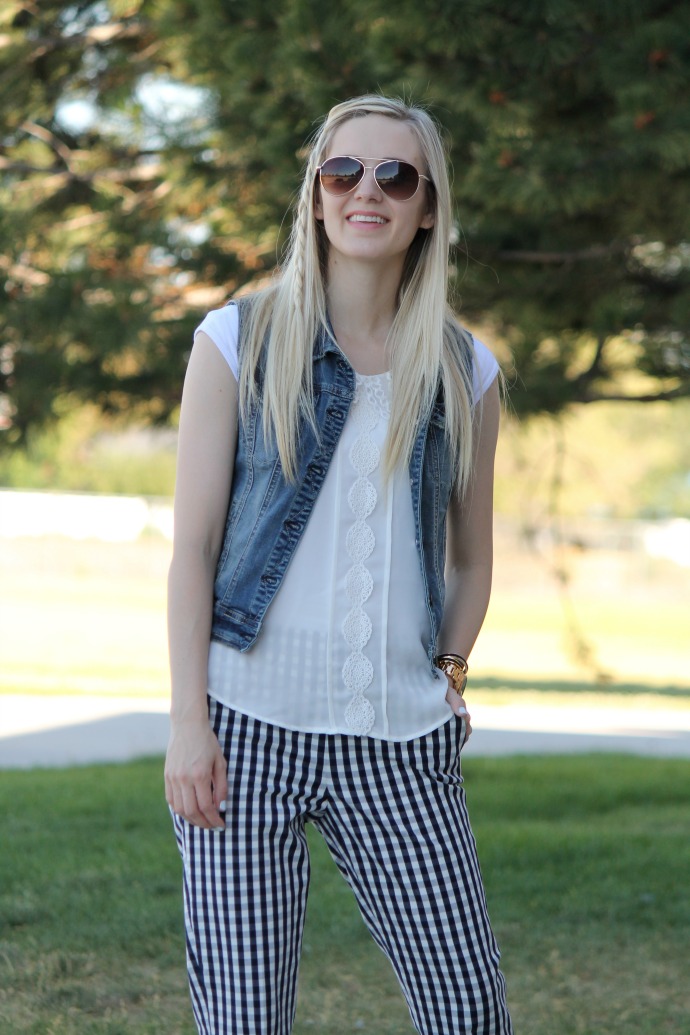 I love my denim vest and am always searching for new ways to wear it – sounds silly because it just pairs over everything, but wearing it with my dressier gingham pants was a fun mix!