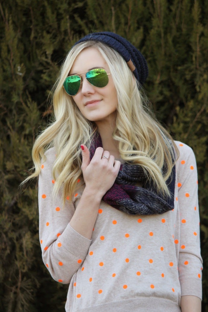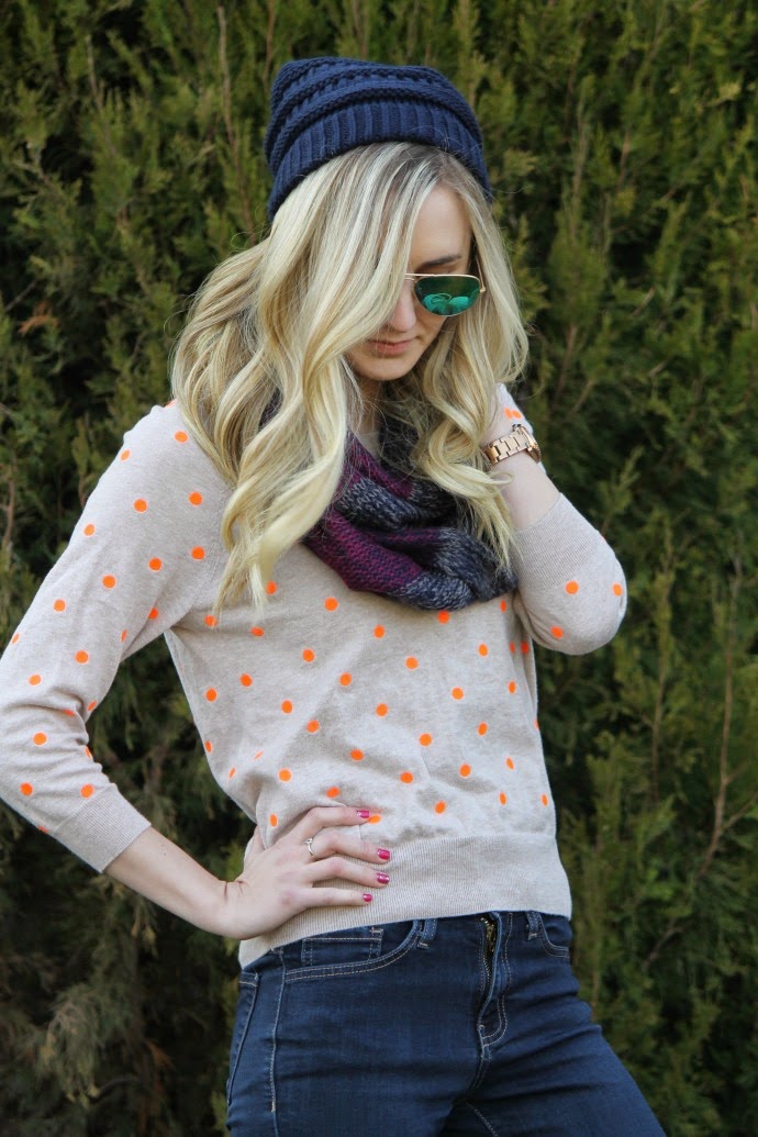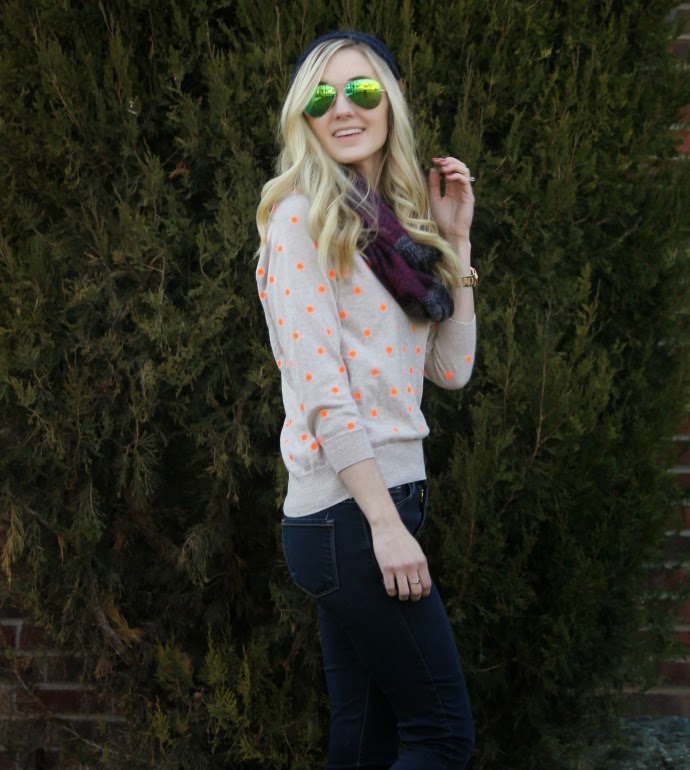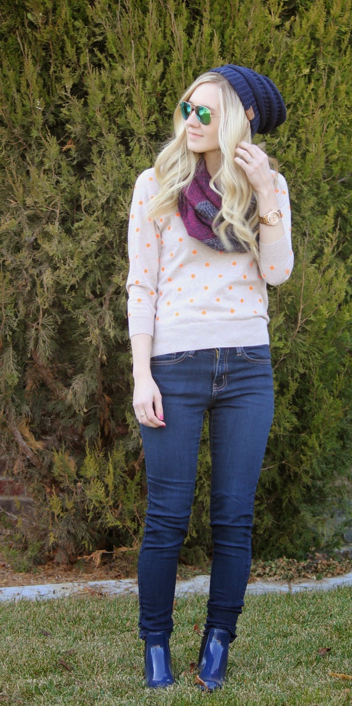 J.Crew Factory sweater (old) // J.Crew boots (leather version linked below) // Fossil watch // Bohme jeans // Bohme beanie // Bohme scarf // Ray Ban Sunglasses