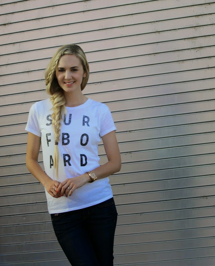 I had a hard time styling my hair this day π I tried a variety of braids, and nothing was really holding in place (my hair is ‘too soft’, which is a good thing -and- a bad thing) so I ended up ditching the extensions for the night and wearing it curly π what do you think??? I also switched out the shoes, and wore the flat sandals to fireworks. I LOVE graphic word tees and when I saw this one I just decided I needed it, I don’t even surf. I really love the vibe it has, plus being a black and white tee is a great touch to pair with all of my colorful shoes π