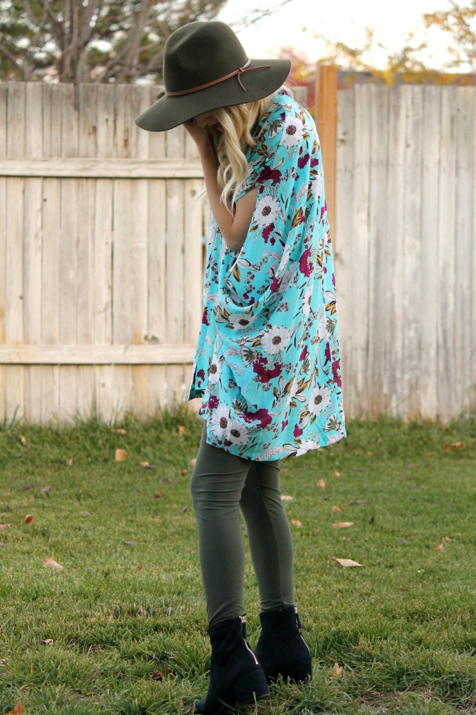 this is one of those outfits that I like never want to change out of. like, really. can I wear this everyday???? leggings, a comfy tee and cute boots?! is this real life?! what an easy combination! I added the floral kimono – because I’m a print/pattern girl π and was feeling a bit naked in just a tee shirt and leggings – hello, it’s the middle of November! but you bet when it’s warmer out I’ll be caught in this ensemble all the time! I’ll be straight up though, I’m posting this outfit about a week since I took the pictures (it’s been crazy here) and I have already worn this tee for like 4 days. π the neckline is perfection – it’s a bit longer in the back and has the prettiest drape. it’s safe to say I could use this in ALL the colors.